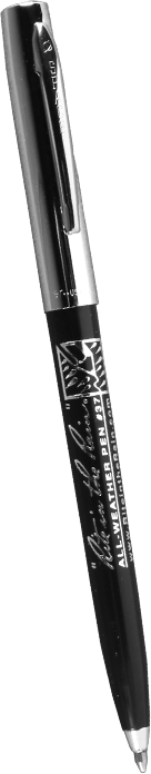 The Rite in the Rain Pen (#37) writes in black ink and works on wet paper. The pressurized ink cartridge allows you to write upside down and can perform in temperatures ranging from -30 F to 250 F.