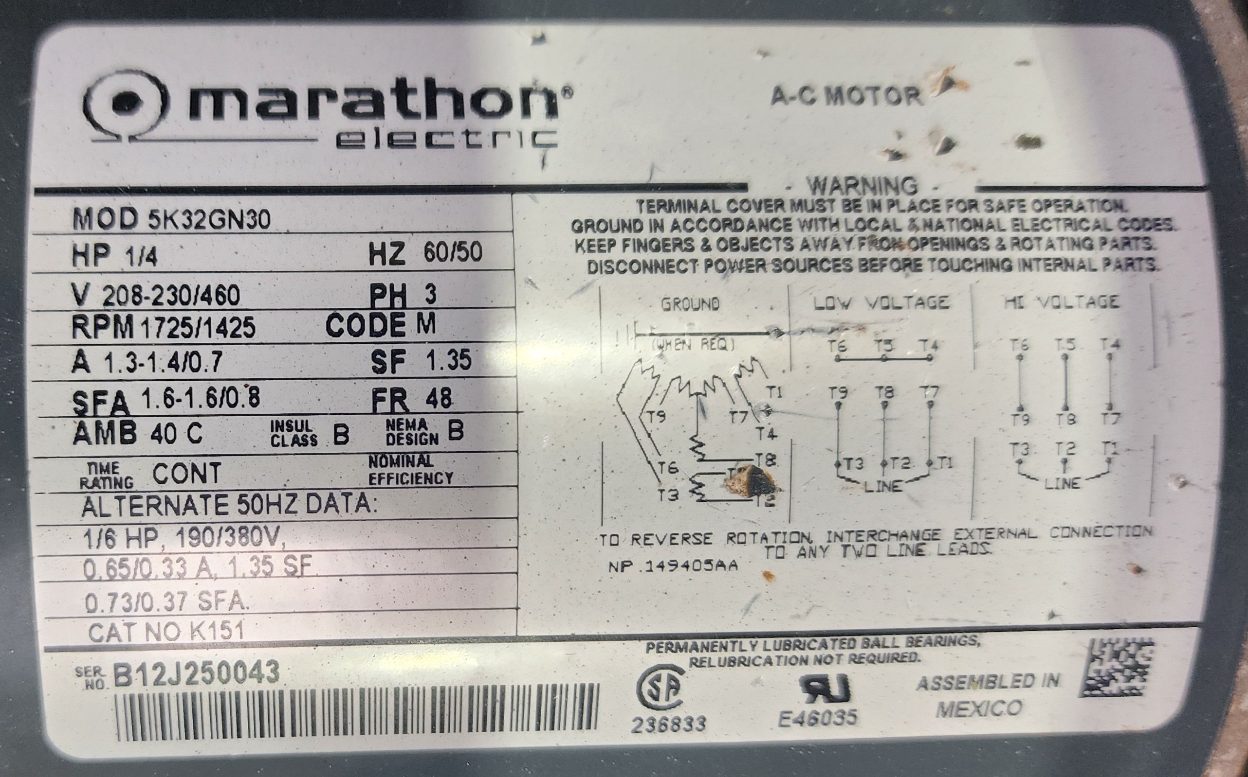 Used American Industrial Heat Exchanger ACA-3182, ¼ HP, 3-Phase, 208-230/460 TEFC Motor. Stock# PR-EEI-2001
