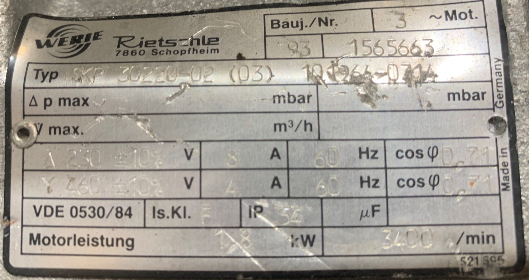Used Rietschle SKP 30220 02 (3) Regenerative Blower 230/460V, 3-Phase, 2.5HP, Motor. Stock #798